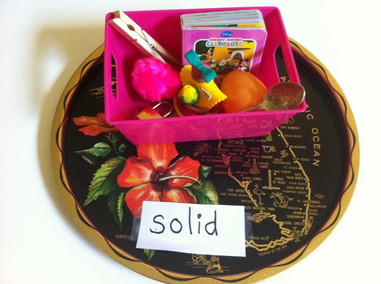 The first tray is where you introduce the three states of matter.  Solid holds a rock, liquid some colored water and gas, an empty jar.  Here is closer look at the bottles: